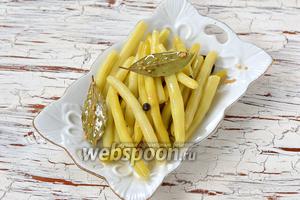 Для маринования нам понадобится свежая стручковая фасоль (зелёная или жёлтая) — 500 грамм, соль — 1 ст. л., сахар — 35 грамм, уксус столовый — 50 мл, масло подсолнечное — 50 мл, вода — 250 мл, 3 лавровых листика, чеснок — 2 зубца, перец чёрный горошком — 4 шт., 3 горошины душистого перца, горчица в семенах — 1 ч. л., кастрюля, дуршлаг, нож, доска кухонная.